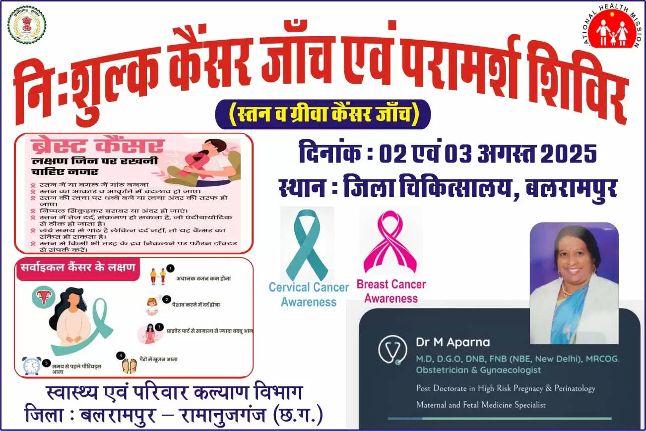 बलरामपुर, 1 अगस्त (हि.स.)। छत्तीसगढ़ के बलरामपुर जिला के कलेक्टर राजेन्द्र कटारा के निर्देशन व मुख्य कार्यपालन अधिकारी जिला पंचायत नयनतारा सिंह तोमर के मार्गदर्शन में महिलाओं को होने वाले कैंसर बीमारी हेतु जिला अस्पताल बलरामपुर में दाे एवं तीन अगस्त को जांच शिविर का आयोजन किया जायेगा।