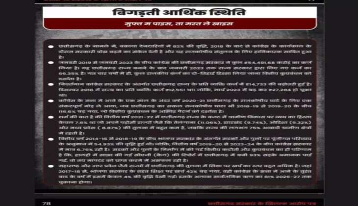 केंद्रीय गृह मंत्री अमित शाह के छत्तीसगढ़ दौरे का आज दूसरा दिन है। अमित शाह भाजपा का आरोप पत्र जारी कर चुके हैं। देखिए पं. दीनदयाल उपाध्याय ऑटोडोरियम में भाजपा का 20 साल बाद बीजेपी आरोप पत्र जारी की हैं. आपको बता दें की भाजपा का आरोप पत्र छत्तीसगढ़ी में लिखा है। कांग्रेस के पांच बछर, छत्तीसगढ़ होगे तितर बितर। भाजपा ने 104 पन्ने का आरोप पत्र जारी किया है। जिसमें अटल बिहारी के संदेशों को भी शामिल किया गया। इसके अलावा भाजपा ने कांग्रेस के घोषणा पत्र के कई बिंदुओं की पोल खोली है। साथ ही कांग्रेस की प्रमुख योजनाओं पर सवाल उठाया। वहीं नक्सल घटनाओं के जरिए सरकार पर टारगेट किलिंग का आरोप भी आरोप लगाया। आरोप पत्र के मुख्य बिंदू 👉 जंगल में वन्य प्राणियों के तस्करों का साम्राज्य , 👉 मानव हाथी के बीच संघर्ष में भ्रष्टाचार 👉 निर्माण कार्य ठप्प 👉 अभिवक्ति का गला घोंटने वाली कांग्रेस 👉 नक्सल घटना के बहाने टारगेट किलिंग का आरोप 👉 सहायक शिक्षकों का दमन करने वाली सरकार 👉 उद्योगों के साथ केवल कागजों में हो रहे MOU