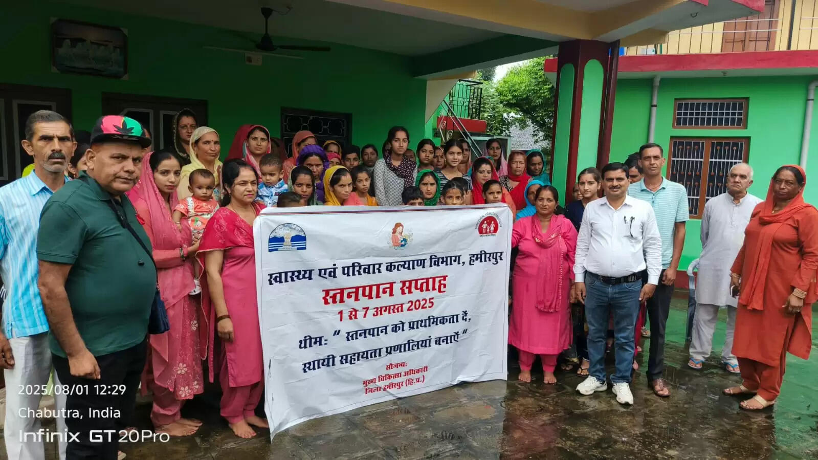 हमीरपुर, 01 अगस्त (हि.स.)। स्तनपान सप्ताह के उपलक्ष्य पर मुख्य चिकित्सा अधिकारी डॉ. प्रवीण चौधरी के निर्देशानुसार स्वास्थ्य विभाग के अधिकारियों एवं कर्मचारियों ने शुक्रवार को प्राथमिक स्वास्थ्य केंद्र चबूतरा के अंतर्गत आंगनवाड़ी केंद्र चबूतरा में जिला स्तरीय स्तनपान दिवस मनाया। इस मौके पर विभाग के जन शिक्षा एवं सूचना अधिकारी बीरबल वर्मा ने उपस्थित प्रतिभागियों को संबोधित करते हुए कहा कि अगस्त का पहला सप्ताह दुनिया भर की माताओं के लिए यादगार समय होता है क्योंकि इसे स्तनपान सप्ताह के रूप में मनाया जाता है। इसका मुख्य उद्देश्य आम लोगों को बच्चे के विकास के पहले 6 महीनों के दौरान मां के दूध के महत्व से अवगत करवाना है।