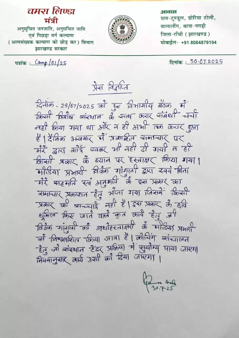 मंत्री ने बताया कि कुछ दैनिक अखबारों में उनके हवाले से एक भ्रामक खबर प्रकाशित की गई, जबकि उन्होंने ऐसा कोई बयान न तो दिया और न ही किसी दस्तावेज पर हस्ताक्षर किया है। उन्होंने कहा कि यह खबर मीडिया प्रभारी विवेक गांगुली ने उनकी अनुमति के बिना भेजी गई थी, जिसमें कोई तथ्यात्मक सच्चाई नहीं है।