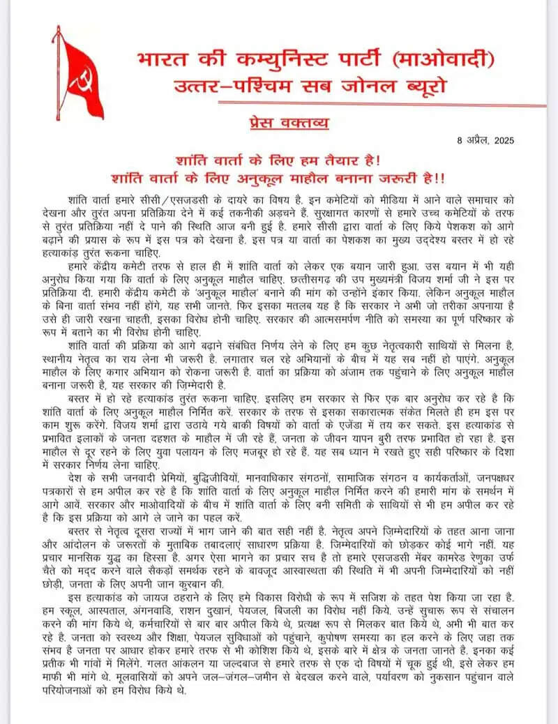 पर्चे में कहा गया है कि हमारी केंद्रीय कमेटी तरफ से हाल ही में शांति वार्ता को लेकर एक बयान जारी हुआ था। उस पर छत्तीसगढ़ के उपमुख्यमंत्री विजय शर्मा ने भी प्रतिक्रिया दी थी। केंद्रीय कमेटी के अनुकूल माहौल बनाने की मांग से उन्होंने इंकार किया। अनुकूल माहौल के बिना यह वार्ता संभव नहीं है। हम सरकार से फिर एक बार अनुरोध करते हैं कि शांति वार्ता के लिए अनुकूल माहौल निर्मित करें। अब सरकार थाे निर्णय लेना चाहिए।