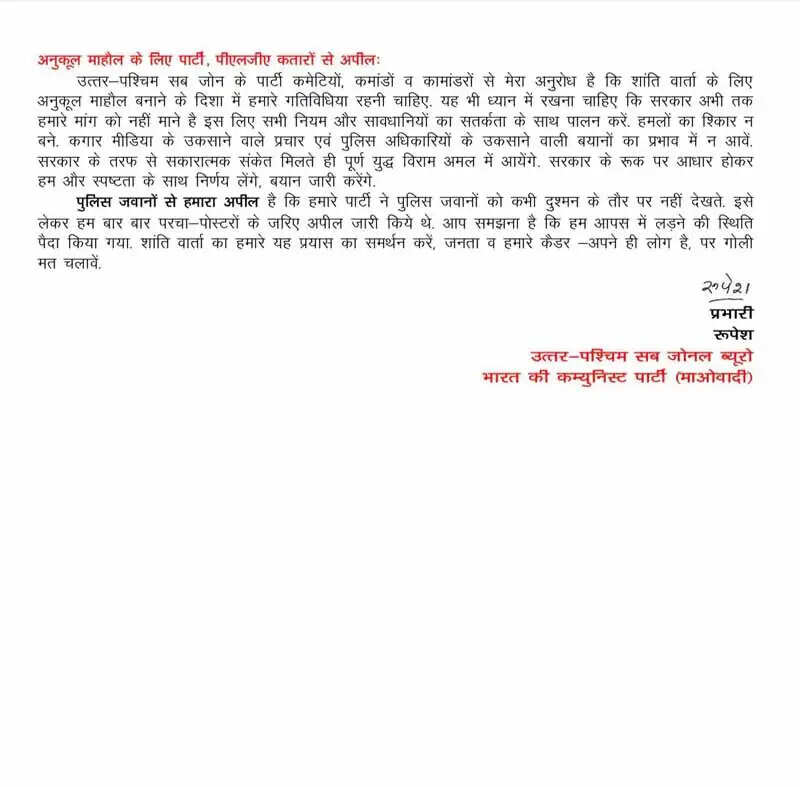 सब जोनल के प्रभारी रूपेश ने अपने पत्र में लिखा कि शांति वार्ता हमारे सीसी व एसजडसी के दायरे का विषय है। मीडिया में आने वाले समाचार को देखना और तुरंत अपना प्रतिक्रिया देने में कई तकनीकी अड़चनें हैं। हमारे सीसी द्वारा वार्ता के लिए किए पेशकश को आगे बढ़ाने के प्रयास के रूप में इस पत्र को देखना है। उन्हाेंने लिखा कि शांति वार्ता की पेशकश का मुख्य उद्देश्य बस्तर में हो रहे हत्याकांड काे तुरंत रोकना है। वार्ता की प्रक्रिया को अंजाम तक पहुंचाने के लिए अनुकूल माहौल बनाना जरूरी है, यह सरकार की भी जिम्मेदारी है, लेकिन सरकार ने हमारे प्रस्ताव को नकार दिया है, ऐसे में वार्ता करना संभव नहीं है। उन्हाेंने पत्र में लिखा कि हम देश के सभी जनवादी प्रेमियों, बुद्धिजीवियों, मानवाधिकार संगठनों, सामाजिक संगठन व कार्यकर्ताओं, जनपक्षधर पत्रकारों से हम अपील कर रहे है कि शांति वार्ता के लिए अनुकूल माहौल निर्मित करने की हमारी मांग के समर्थन में आगे आवें और इस प्रक्रिया को आगे ले जाने की पहल करें।