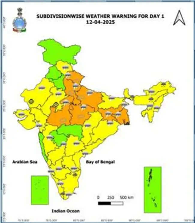 12 से 14 अप्रैल के दौरान मध्य भारत और महाराष्ट्र के मैदानी इलाकों में आंधी, बिजली और तेज हवा (40-50 किमी प्रति घंटे की गति) के साथ छिटपुट वर्षा की संभावना है। 12 अप्रैल को तमिलनाडु, केरल, उप-हिमालयी पश्चिम बंगाल और सिक्किम में, 12 -14 अप्रैल को अरुणाचल प्रदेश, असम और मेघालय में तथा 14 और 15 अप्रैल को ओडिशा में भारी वर्षा की संभावना है। 12 अप्रैल को उत्तराखंड, मध्य प्रदेश और उत्तर प्रदेश में और 15 अप्रैल को झारखंड में कहीं-कहीं ओलावृष्टि की संभावना है। 12 अप्रैल को उत्तर प्रदेश और पूर्वी राजस्थान में अलग-अलग स्थानों पर धूल भरी आंधी चलने की संभावना है। 12 अप्रैल को मध्य प्रदेश, पूर्वी उत्तर प्रदेश में अलग-अलग स्थानों पर गरज के साथ बौछारें (हवा की गति 50-60 किमी प्रति घंटा) पड़ने की संभावना है।