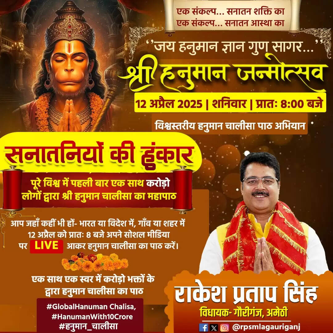 अमेठी, 10 अप्रैल (हि.स.)। जिले की सदर विधानसभा सीट गौरीगंज से समाजवादी पार्टी के विधायक राकेश प्रताप सिंह ने अनोखी पहल की है। जिसके तहत आगामी 12 अप्रैल 2025 दिन शनिवार को हनुमान जन्मोत्सव के दिन प्रातः 8:00 बजे देश-विदेश से लगभग 10 करोड़ भक्तों द्वारा एक साथ हनुमान चालीसा का पाठ विभिन्न सोशल मीडिया पर लाइव कराने की ठानी है।