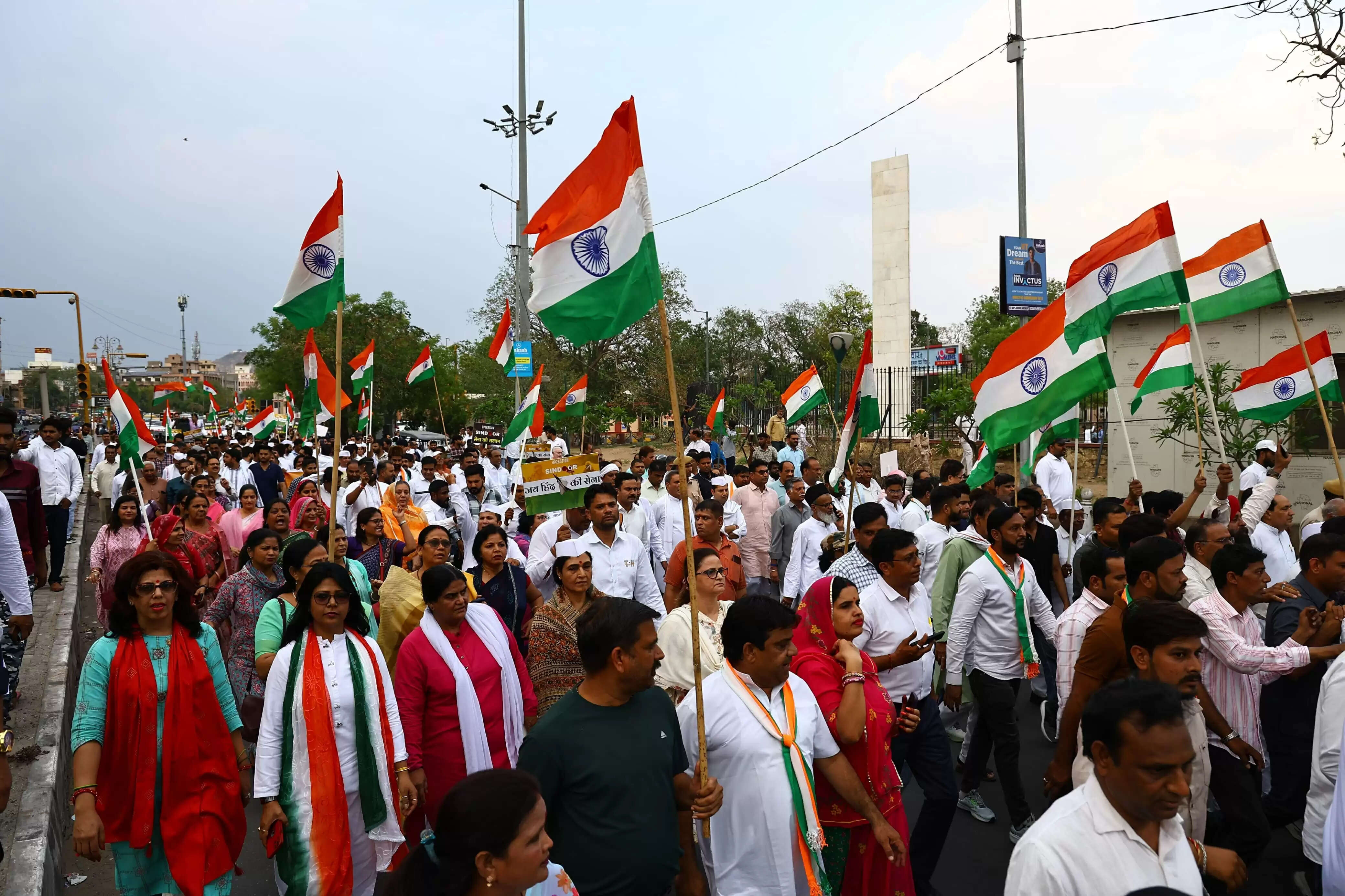 जयपुर, 9 मई (हि.स.)। पाकिस्तान समर्थित आतंकवादियों द्वारा निर्दोष नागरिकों की हत्या करने पर भारतीय सेना द्वारा सफलतापूर्वक ऑपरेशन सिंदूर के तहत कार्यवाही करते हुये दोषी आतंकवादियों का खात्मा किया गया है। भारतीय सेना के इस पराक्रम व शौर्य के सम्मान में तथा देश के सशस्त्र बलों के मनोबल के उत्साहवर्धन के लिए प्रदेश कांग्रेस कमेटी द्वारा कांग्रेस मुख्यालय से शहीद स्मारक तक जय हिन्द यात्रा निकाली गई।