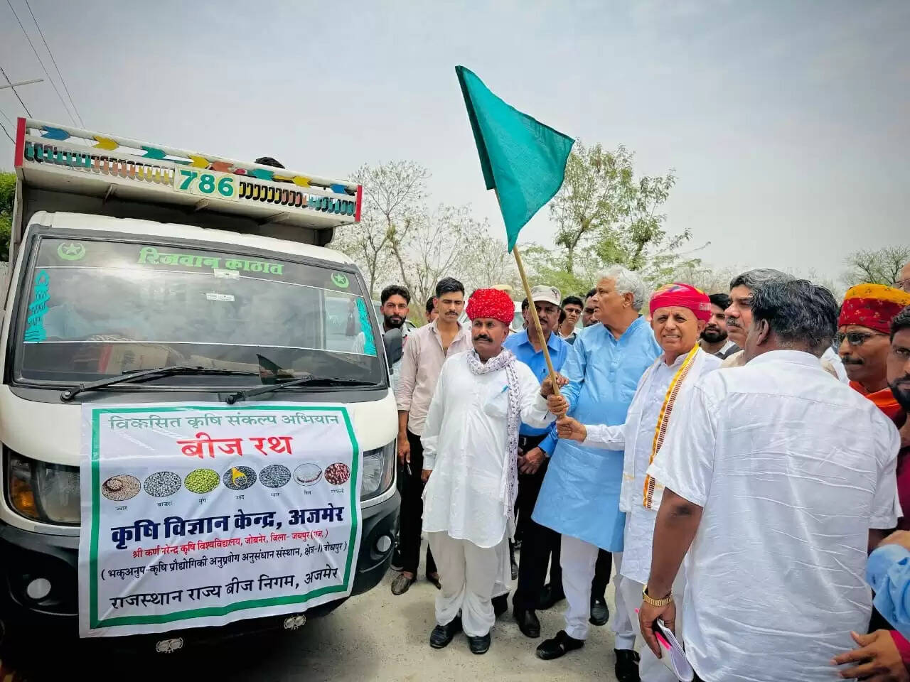 अजमेर, 29 मई (हि.स.)। भारत सरकार के कृषि मंत्रालय द्वारा किसानों की समृद्धि और कृषि क्षेत्र में नवाचार को बढ़ावा देने के उद्देश्य से विकसित कृषि संकल्प अभियान का गुरुवार को शुभारंभ किया गया। अभियान का राज्य स्तरीय शुभारंभ ग्राम पंचायत रलावता से किया गया। इस अवसर पर केंद्रीय कृषि राज्य मंत्री भागीरथ चौधरी एवं कृषि मंत्री किरोड़ी लाल मीणा ने कार्यक्रम को संबोधित किया और बीज रथ को हरी झंडी दिखाकर रवाना किया। कार्यक्रम का आयोजन कृषि विज्ञान केंद्र तबीजी के तत्वावधान में किया गया।