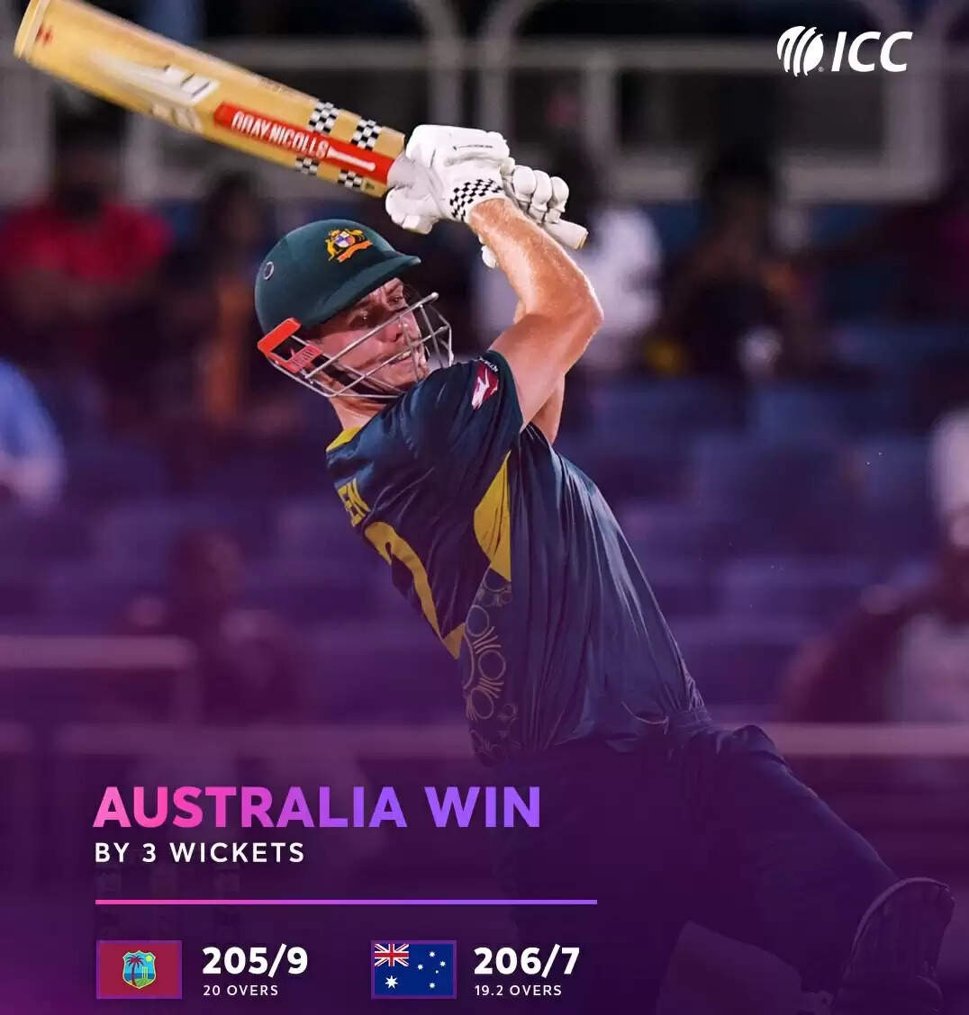 सेंट किट्स और नेविस के बस्सेटेरे में खेले गए इस मुकाबले में टॉस हारकर पहले बल्लेबाजी के लिए उतरी वेस्टइंडीज की टीम ने 20 ओवर में नौ विकेट के नुकसान पर 205 रन का बड़ा स्कोर बनाया। जवाब में ऑस्ट्रेलिया की टीम ने इस लक्ष्य को 19.2 ओवर में सात विकेट खोकर 206 रन बनाते हुए हासिल कर लिया है।
