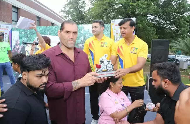 दिल्ली में द ग्रेट खली ने बढ़ाई शोभाराष्ट्रीय राजधानी नई दिल्ली के मेजर ध्यानचंद स्टेडियम में फिट इंडिया संडे ऑन साइकिल कार्यक्रम एक उत्सव जैसे माहौल में आयोजित किया गया, जिसमें रस्सी कूद, जुम्बा और हठ योग गतिविधियां शामिल थीं। पूर्व डब्ल्यूडब्ल्यूई वर्ल्ड हैवीवेट चैंपियन और यह उपलब्धि हासिल करने वाले एकमात्र भारतीय दलीप सिंह राणा उर्फ द ग्रेट खली ने इस अभियान को हरी झंडी दिखाई। 3000 से ज्यादा युवा और बुजुर्ग फिटनेस प्रेमियों की उपस्थिति में 52 वर्षीय खली ने भारत के 'विश्वगुरु' बनने में फिटनेस के महत्व पर जोर दिया।