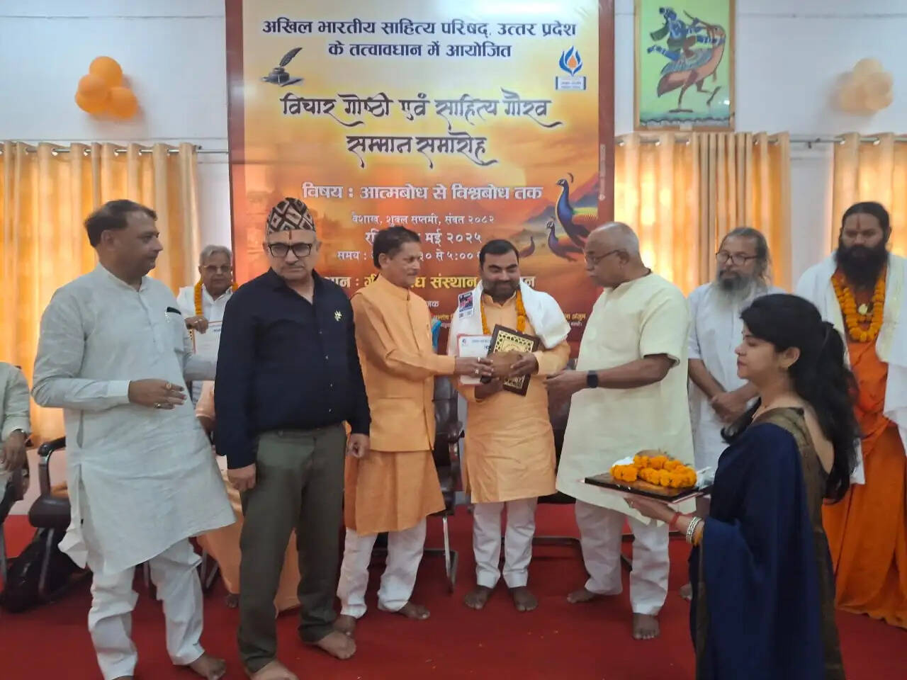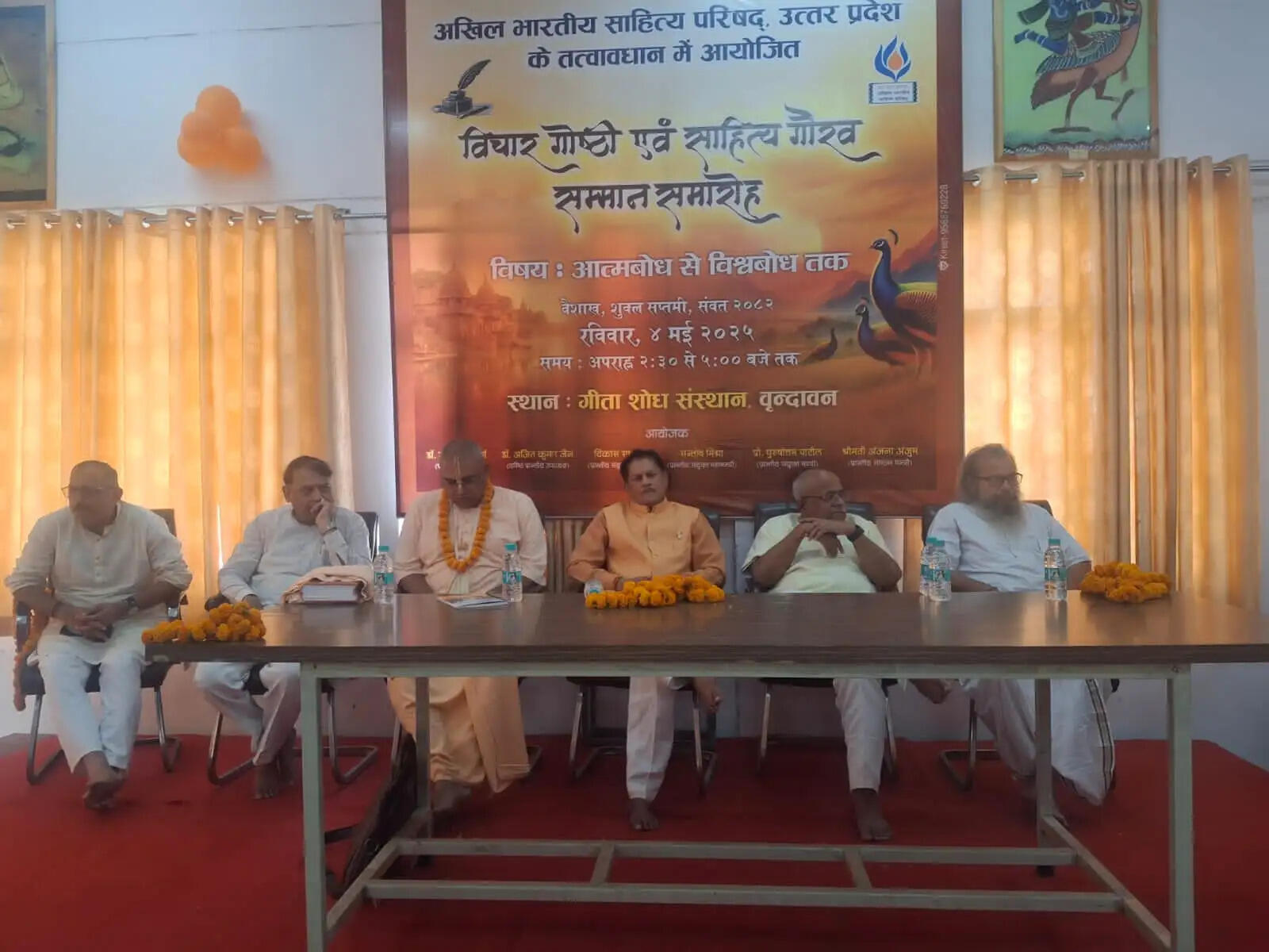 मथुरा, 04 मई (हि.स)। अखिल भारतीय साहित्य परिषद उत्तर प्रदेश की ओर से रविवार को गीता शोध संस्थान वृंदावन में आत्मबोध से विश्व बोध तक विषय पर संगोष्ठी का आयोजन किया गया। इस अवसर पर अलग-अलग भाषा बोलियों के साहित्यकारों को साहित्य गौरव सम्मान समारोह प्रदान किया गया।