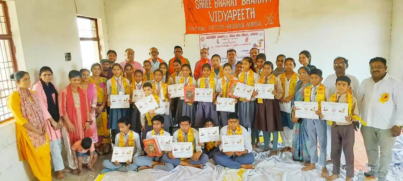 भारत भारती विद्यापीठ में आयोजित रामचरितमानस गायन एवं वाचन कार्यशाला के अंतिम दिन मुख्य अतिथि प्रदेश अध्यक्ष उत्तर प्रदेश प्रधानाचार्य परिषद राजेश कुमार अग्निहोत्री, विशिष्ट अतिथि जिला मंत्री प्राथमिक शिक्षक संघ औरैया अरविंद राजपूत ने संयुक्त रूप से कहा कि भगवान प्रभु श्री राम का आदर्श चरित्र हमें अपने जीवन में उतारना चाहिए। उन्होंने कहा कि प्रभु राम का अपने माता पिता, गुरु, प्रजा, सेवक और मित्र भाइयों के साथ जैसा व्यवहार था वैसा ही आचरण हम सभी को मिलकर अपनाना होगा, तभी सभी का मंगलमय होगा।